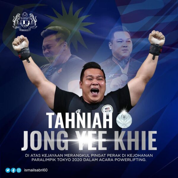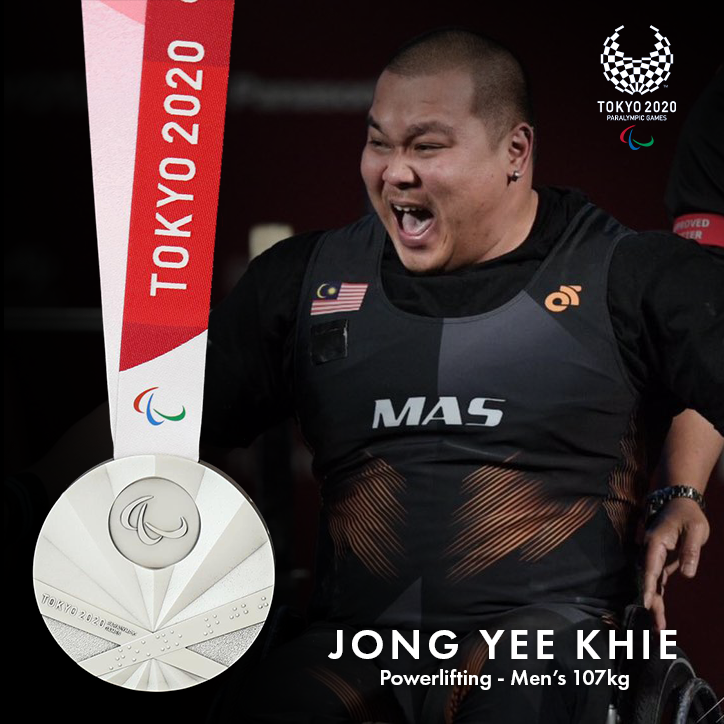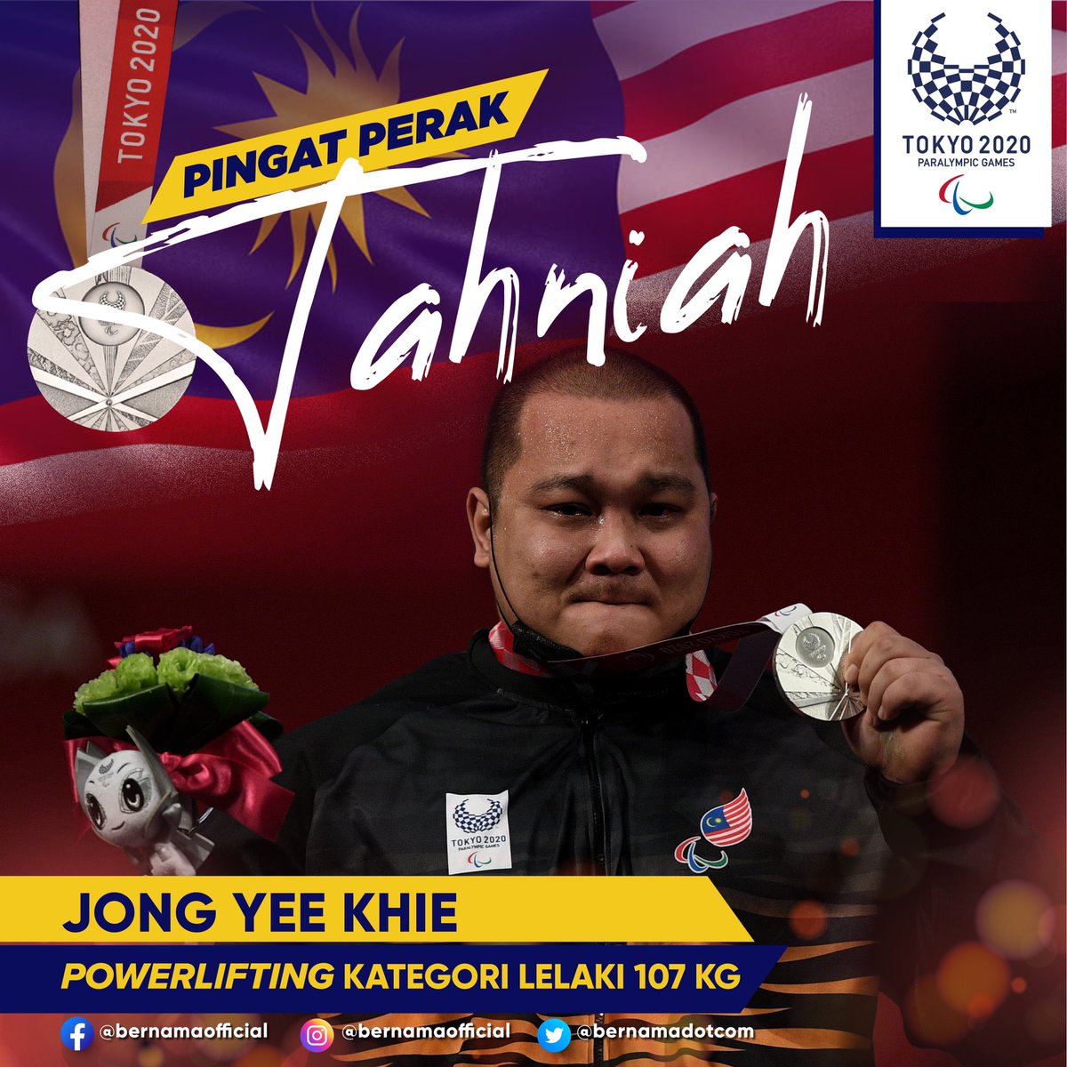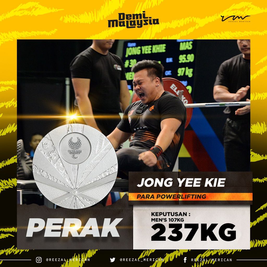 Atlet powerlifting kebangsaan Jong Yee Khie berjaya merangkul perak dalam acara lelaki 107 kilogram kg yang juga merupakan pingat kedua negara di Sukan Paralimpik Tokyo di sini hari ini. Setelah terlepas angkatan pertama 230kg Yee Khie mengangkat bebanan 237kg pada angkatan kedua. Setahun kemudian dia menyertai Kejohanan Powerlifting Para Dunia di Mexico City dalam kategori sama dan berada dalam kelompok enam terbaik.